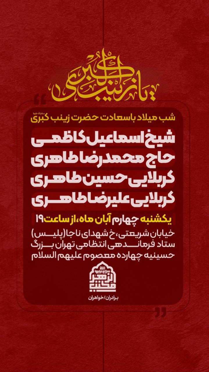 آقا درباره مداح اینجوری حرف نزنید بده زشته. ایشون عدا در نمیاره درباره ایشون و مداحان درست حرف بزنید 🙏 ممنونم. شب خوش. حاج حسین عالی بود. اجرت با امام حسین و حضرت زینب و ممنونم از حاج آقا طاهری 👌 یا علی